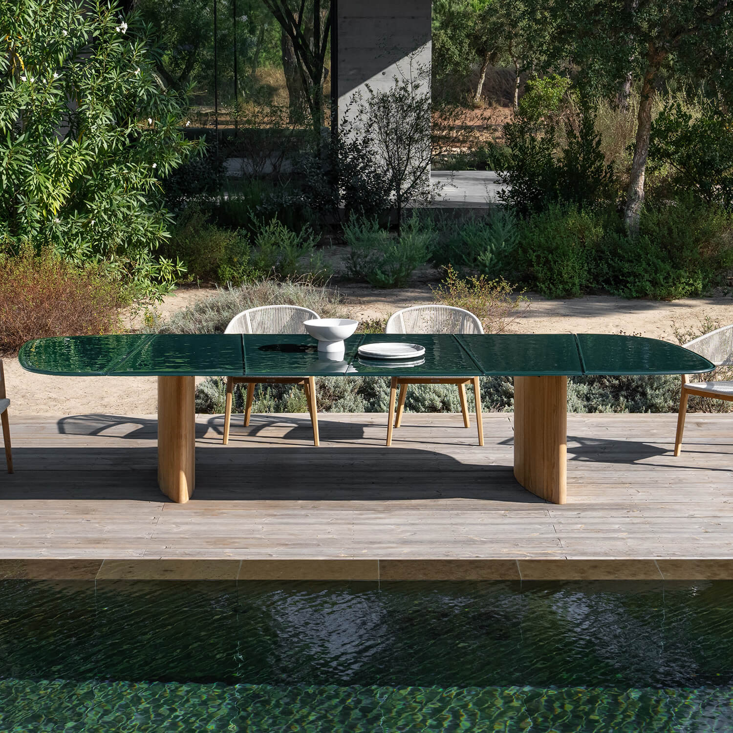 Available in three refined, earth-inspired finishes, Dark Green, Dark Brown, and Pebble, the glass top feels like a piece of liquid art held in place by a massive teak frame.